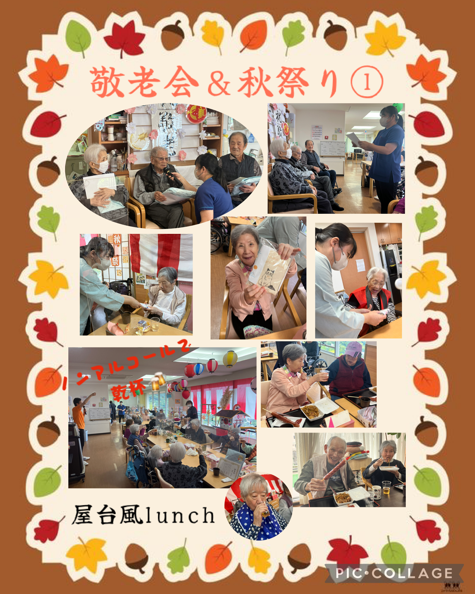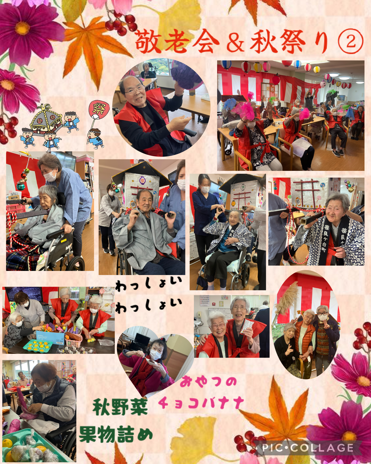 だいぶupするのが遅くなってしまいましたが、10月29日ぽっかぽか熱海館2号館にて敬老の日のお祝い・秋祭りが行われました。敬老の日のお祝いでお昼食に屋台風lunchを🥢ノンアルコールを〝乾杯🍻〟と掲げて、とてもいい飲みっぷり◎焼きそば・たこ焼きとスタッフもびっくりしてしまったロングフランクフルト♬皆様とても美味しそうに召し上がっていました。午後からは2つの集いを行いました。お一人お一人に施設長からお祝いのプレゼント🎁を頂き、とても喜んでいました。また、卒寿・白寿・百寿を迎えられた3名の方々からコメントを頂き、とてもほっこりとした気持ちになりました◎ガラッと変わって秋祭りのスタート!!スタッフ手作りの御神輿を担いだり、利用者様が大好きな花笠音頭を踊ったりと、大盛り上がりでした♬3時のおやつにはチョコバナナを頂き、お昼はソース・3時はチョコを口の端に付けて、皆様とても可愛らしかったです♡