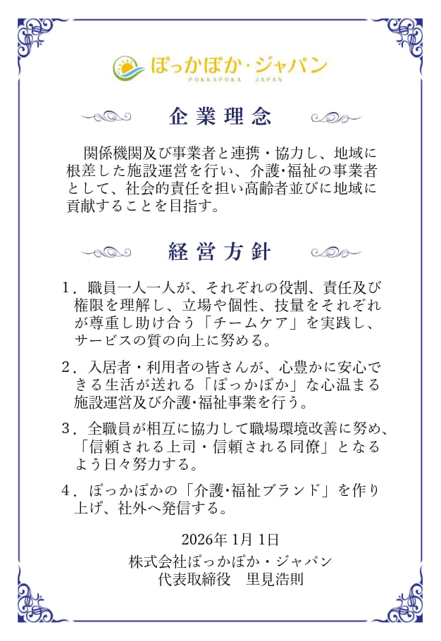 令和8年の運営方針です。企業理念は変わりませんが、今年一年の運営方針(4項目)に基づき職員と共により良い施設づくりを進めてまいります。