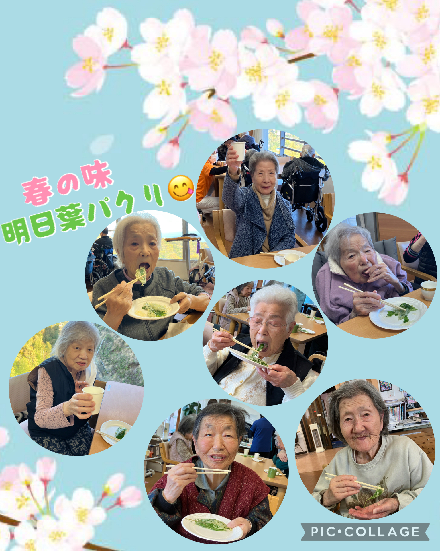施設に戻ってからは、職員お手製の明日葉の天ぷら・ 桜餅を食べながらノンアルコール・ 甘酒を飲みとても楽しい時間となりました